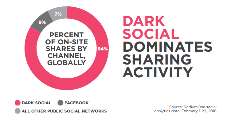 84% of social sharing actually happens through dark social platforms where as 90% of social media marketing investment is on public social platforms.
